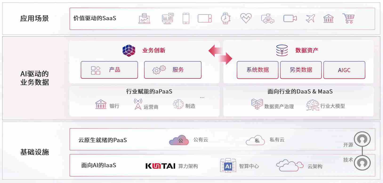 数字时代,,,,围绕企业数字化转型的关键要素,,,尊龙旗舰厅数码开创性的提出数云融合战略和技术体系框架,,着力在云原生、、数字原生、、、、AI原生和信创产业上架构产品和服务能力,,为处在不同数字化转型阶段的快消零售、、、、汽车、、金融、、、医疗、、、政企、、教育、、、、运营商等行业客户提供泛在的敏捷IT能力和融合的数据驱动能力,,构建跨界融合创新的数字业务场景和新业务模式,,,,助力企业级客户建立面向未来的核心能力和竞争优势,,全面推动社会的数字化、、、智能化转型升级。。。。
