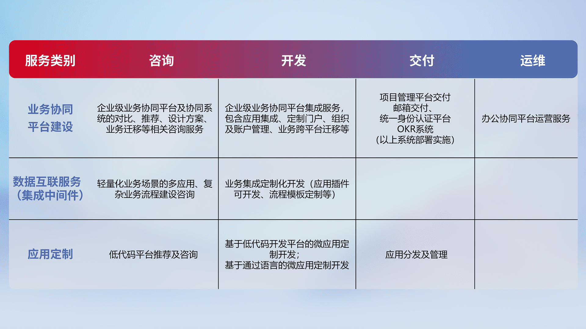 针对钉钉、、、、企微、、、、IDaas等平台级产品提供产品的规划、、、、方案、、、、交付、、、、定制化开发等服务,,实现如统一协同办公、、智能客户服务、、、、混合会议管理、、、、智能数据查询、、等业务场景,,,,实现数字化转型。。。。